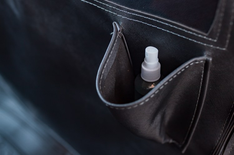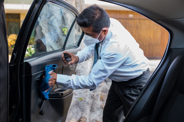 5. Con el rociador, procederá a desinfectarse las manos, luego desinfectará toda la unidad: las manijas de las puertas, cinturones de seguridad y asientos. Todo esto, en presencia del usuario antes de subir a la unidad.