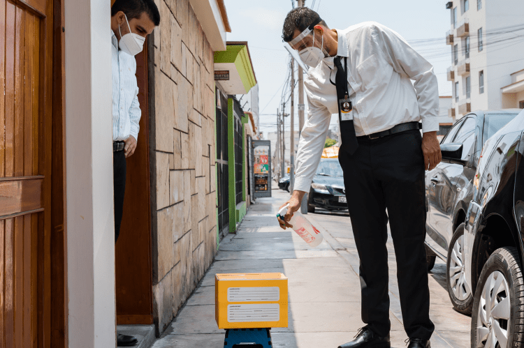 8. En los servicios de courier, se contará con un banco y protector facial. Se procederá a desinfectar la silla y el paquete en presencia del usuario.